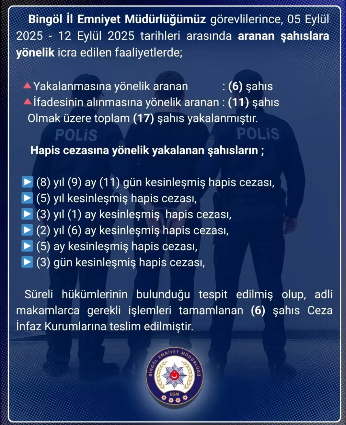 Bingöl İl Emniyet Müdürlüğü takımlarınca 5-12 Eylül 2025 tarihleri ortasında gerçekleştirilen çalışmalarda, haklarında çeşitli cürümlerden arama kaydı bulunan 17 kişi yakalandı. Yapılan çalışmalarda, haklarında mutlaklaşmış mahpus cezası bulunan 6 şahıs tutuklanarak cezaevine gönderildi. – BİNGÖL