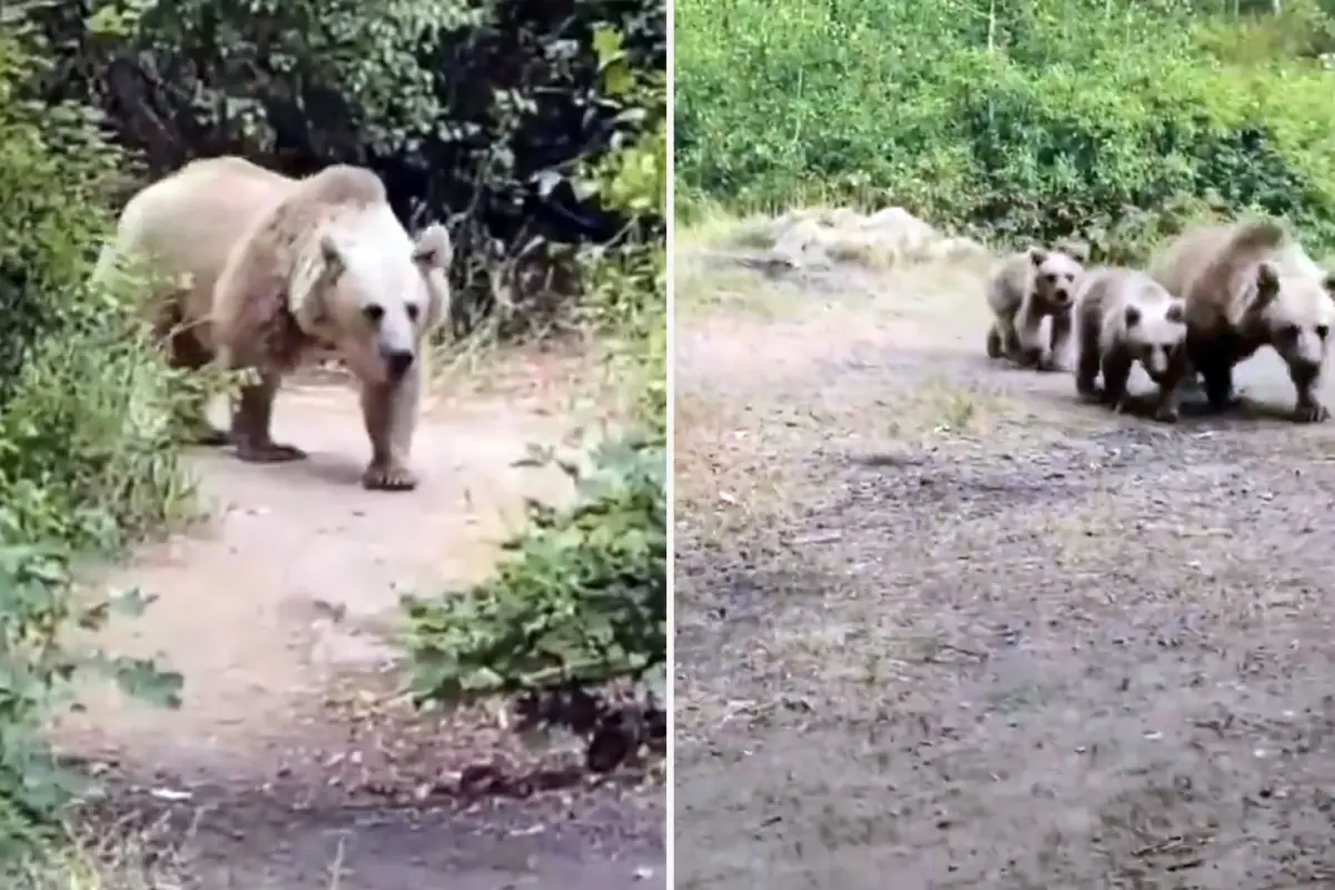 Görüntüleri çeken şahıs ailesine, “Sakin olun saldırmaz. Korkmayın” diyerek itidalli kalmaya çalıştı. Yavrularıyla birlikte yürüyen ayı, korkunca bir anda hücuma geçti. O anlarda ailenin çığlıklar attığı duyuldu.